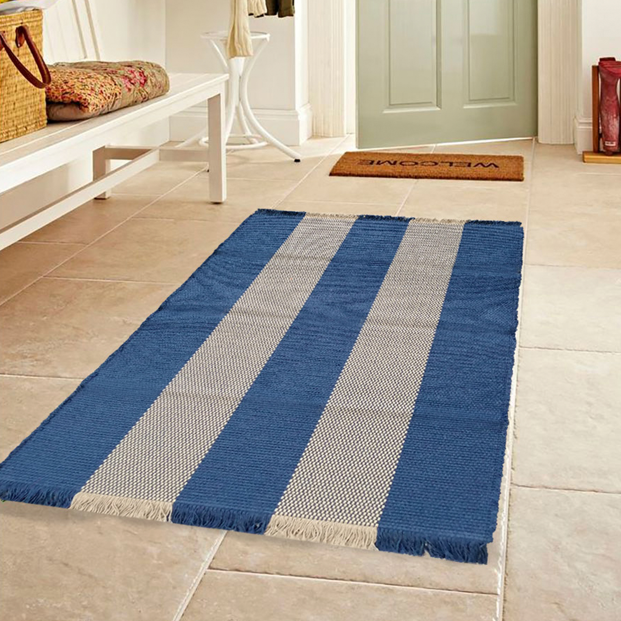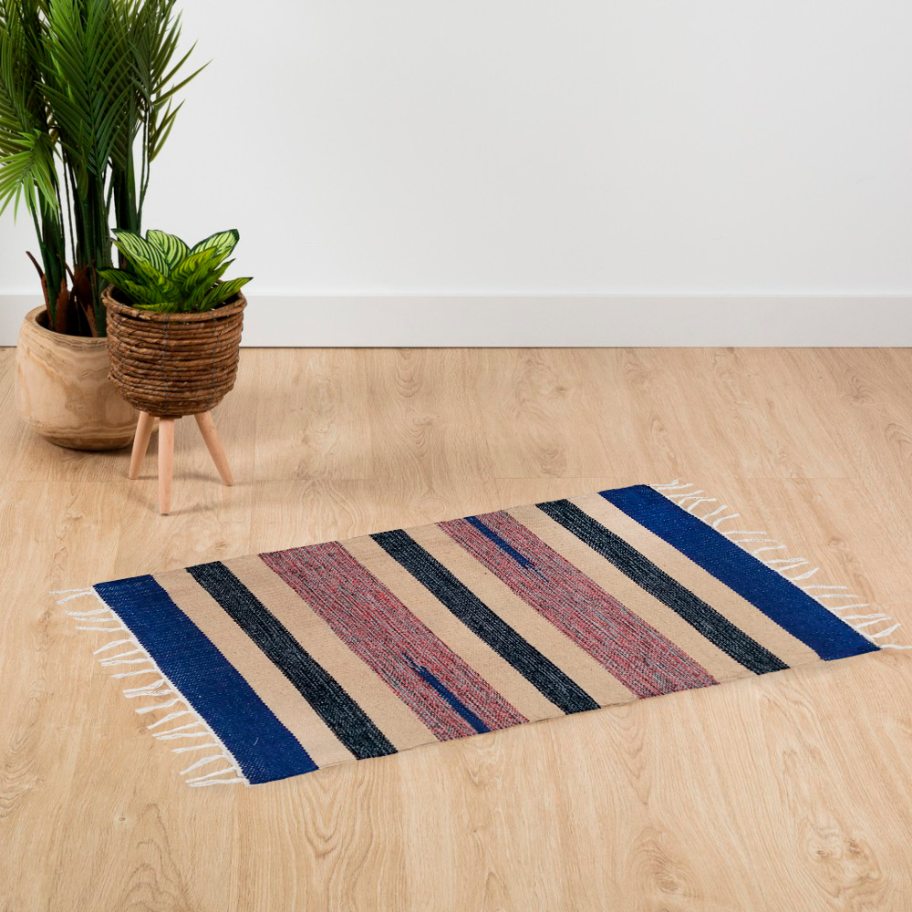 O Tapete Baleal é fabricado em 100% algodão, apresentando um design contemporâneo que combina um fundo de cor lisa com um delicado padrão de linhas transversais em tons contrastantes. Este toque de textura cria um efeito visual dinâmico e elegante.